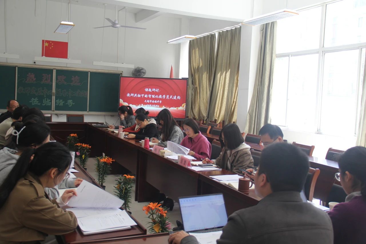 2024年3月29日上午,无锡市安镇中学六号楼底楼会议室座无虚席,一场关于“教研共融下的智能化教学范式建构”的课题研讨活动正在热烈展开。此次活动汇聚了该校全体行政和部分青年骨干教师,以及特邀专家江阴市教师发展中心科研部张慧主任和锡山区教师发展中心科研部鲍宇老师,共同探讨教育智能化的未来之路。